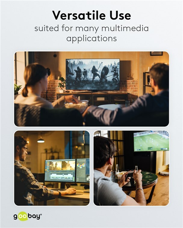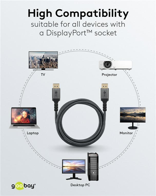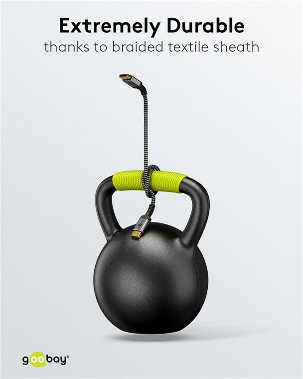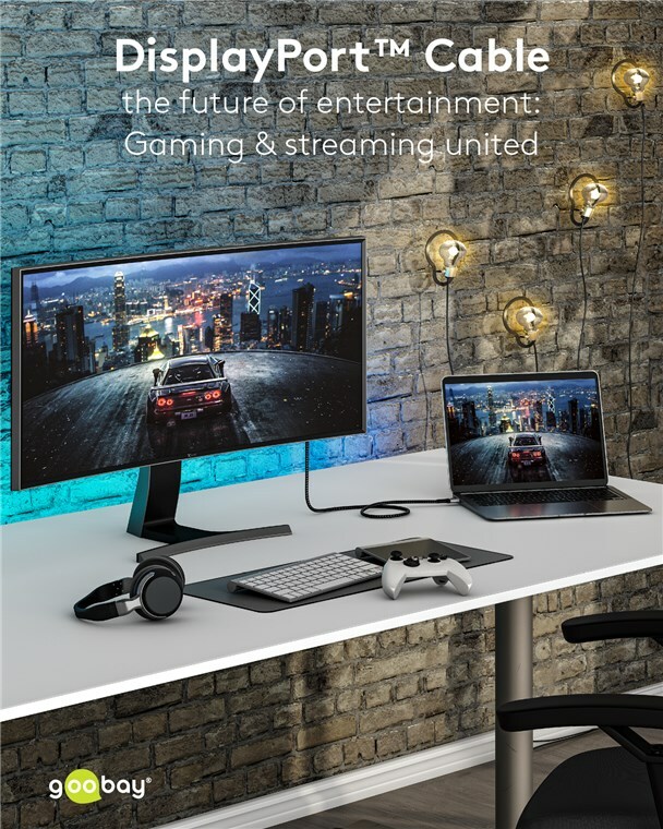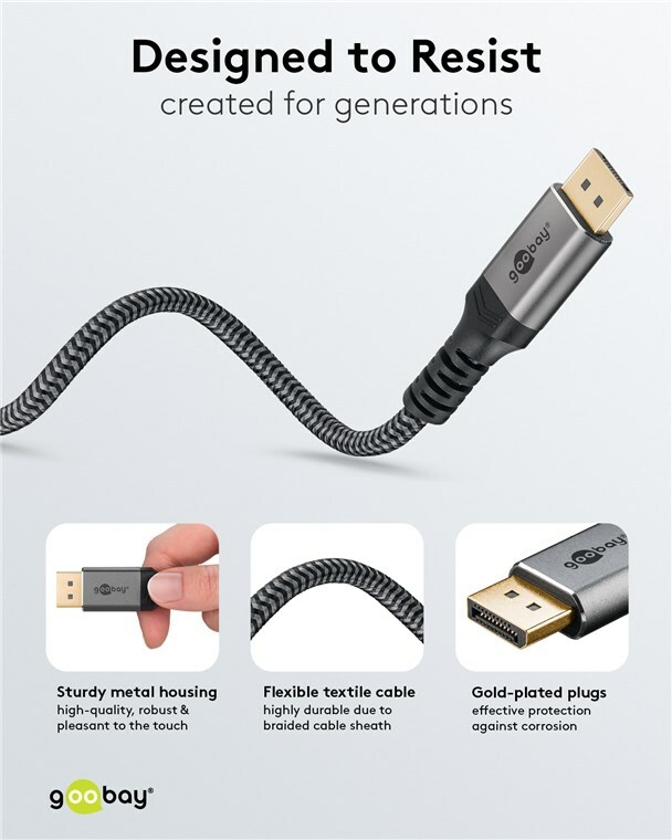 The Goobay Plus series comes in a slim, elegant metal design in Sharkskin Grey. Equipped with the DisplayPort™ 1.4 standard, the cable provides a particularly high bandwidth - for smooth image playback without screen tearing or judder when gaming and a razor-sharp resolution with up to 8K.
