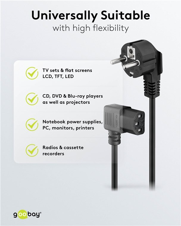 - power cord suitable for e.g. PC, monitor, beamer or laptop and other devices with a C14 plug