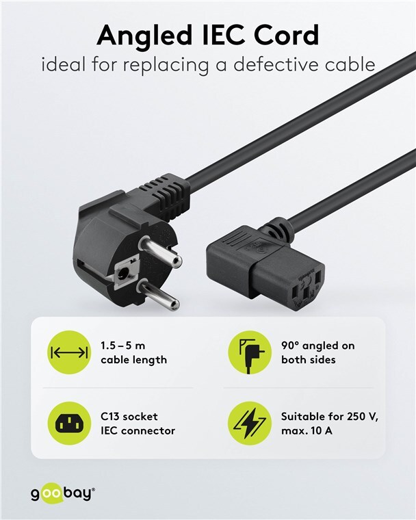 - Univerzálny napájací kábel s uhlovou IEC zásuvkou a uhlovou bezpečnostnou zástrčkou