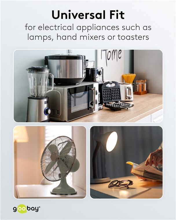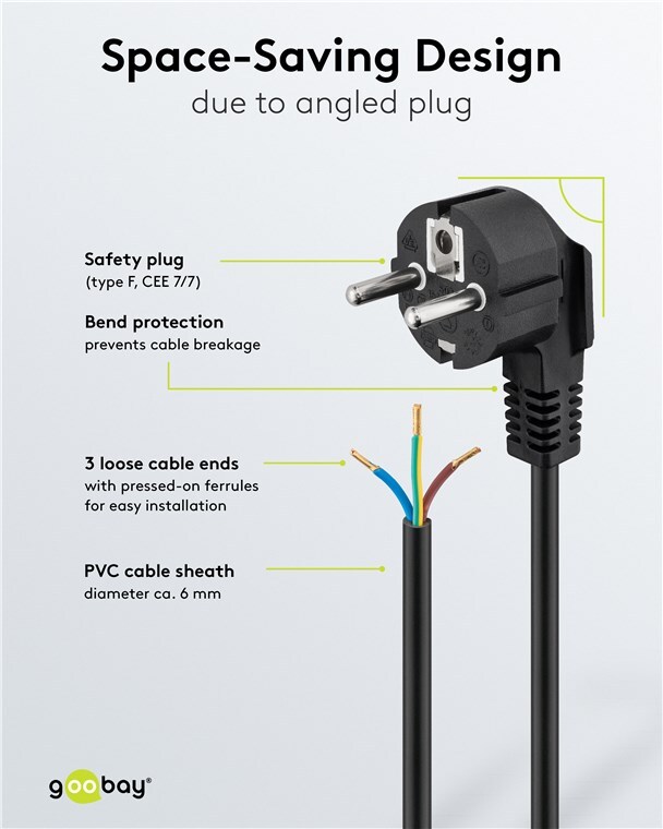 - Mains cable with plug (angled) for connecting to electrical appliances