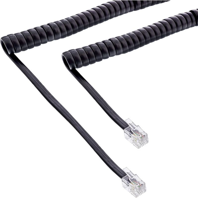 Coiled cable for connecting the handset to the base station. Both ends are fitted with RJ10 plugs (4-pin). The length specification corresponds to the cable in its maximum extended state. A longer distance to the spiral on one side allows the cable to be laid in or under the telephone.