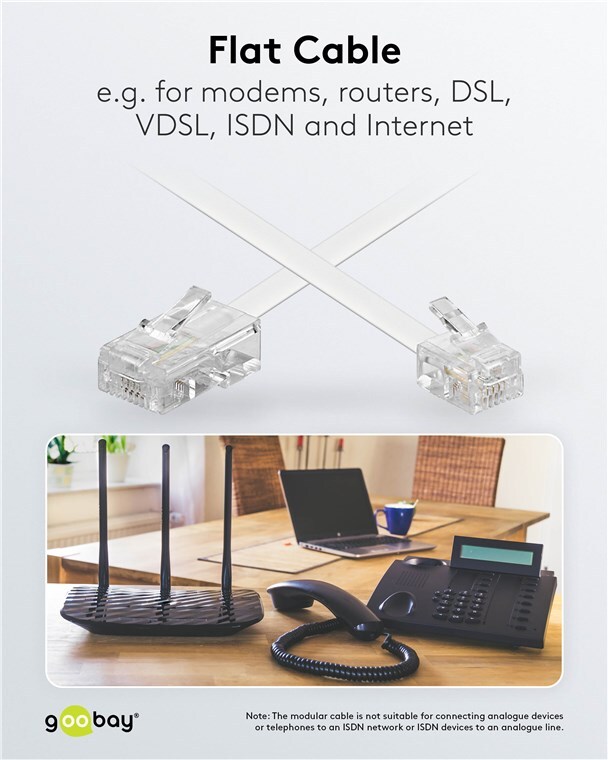 - Flat cord (2.2 x 4.7 mm) can be universally used for e.g modem, router, DSL, VDSL, ISDN and internet.