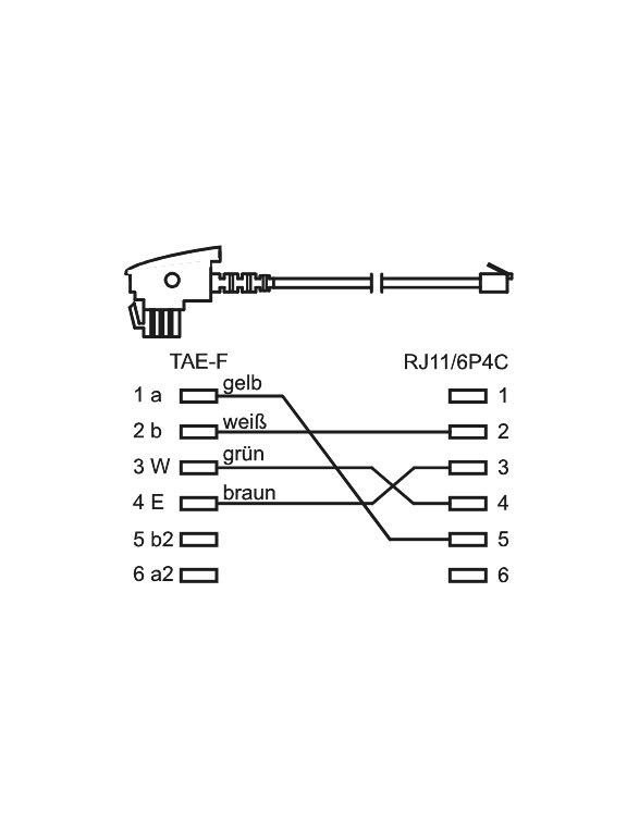 - Standardised modular plugs (TAE-F plug to RJ11 plug) with 4-wire assignment: 1(a) - 5, 2(b) - 2, 3(W) - 4, 4(E) - 3