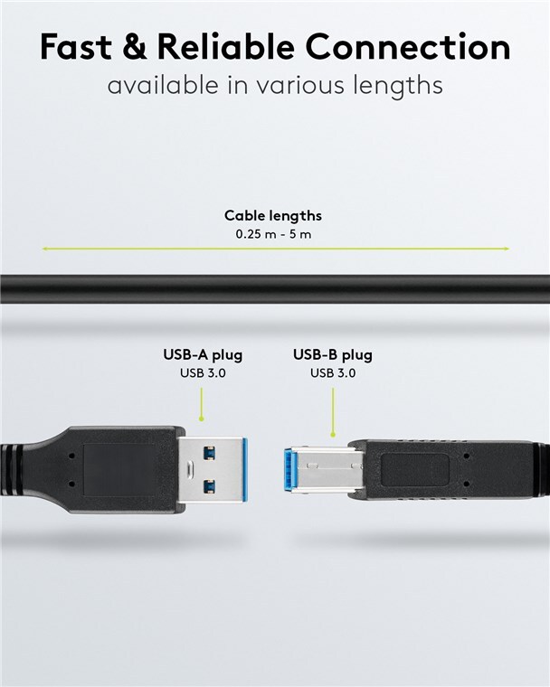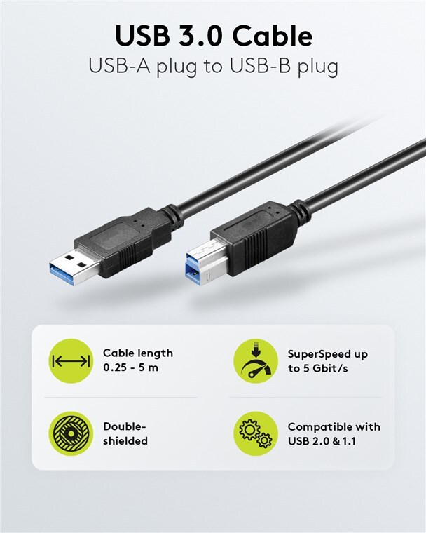 - USB 3.0 cable for connecting devices with USB-A, e.g. PC or laptop, to USB-B devices such as printers, servers, USB hard drives and external hard drives