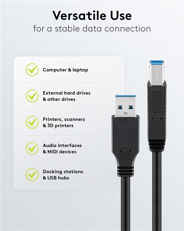 - Suitable for devices with a USB-B port, e.g. scanners, multifunction printers, USB hubs, docking stations, webcams or hard drive housings