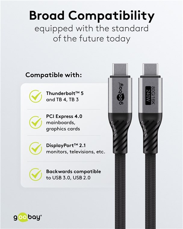 Štandard budúcnosti, už dnes – s najrýchlejším USB káblom vôbec. S gigantickými dátovými rýchlosťami 80 Gbit/s a elektrizujúcim výkonom 240 W tento kábel konkuruje aj úplne novému Thunderbolt™ 5 a stáva sa šampiónom v hernom sektore. Teraz je k dispozícii excelentnosť budúcnosti pre vysokovýkonné notebooky, viacmonitorové zostavy s vysokým rozlíšením, výkonné grafické karty a základné dosky.