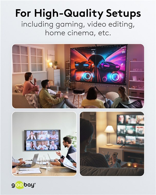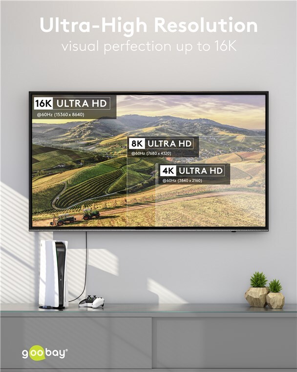 - Kábel podporuje ultra vysoké rozlíšenie až 16K pri 60 Hz/4K pri 120 Hz na jednom monitore a pri rozdelení signálu na dva monitory cez rozbočovač dva výstupy 8K pri 60 Hz.