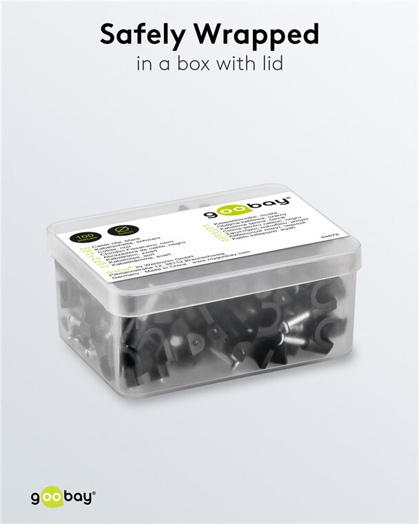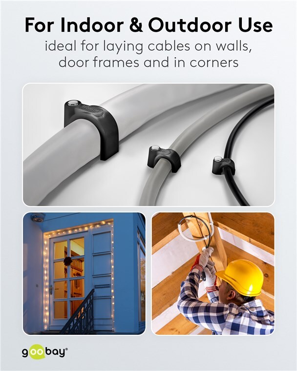 Cable organizer ideal for laying cables on walls, door frames and corners. High-quality stabilised PE plastic and galvanised steel nails. You may use the cable clips with nail indoors and outdoors and achieve good insulation, corrosion resistance and aging resistance.