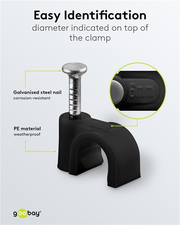 Cable organizer ideal for laying cables on walls, door frames and corners. High-quality stabilised PE plastic and galvanised steel nails. You may use the cable clips with nail indoors and outdoors and achieve good insulation, corrosion resistance and aging resistance.
