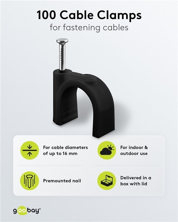 Organizér káblov ideálny na kladenie káblov na steny, zárubne a rohy. Vysokokvalitný stabilizovaný PE plast a pozinkované oceľové klince. Káblové svorky s klincami môžete použiť v interiéri aj exteriéri a dosiahnuť tak dobrú izoláciu, odolnosť voči korózii a starnutiu.