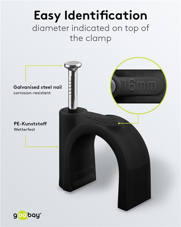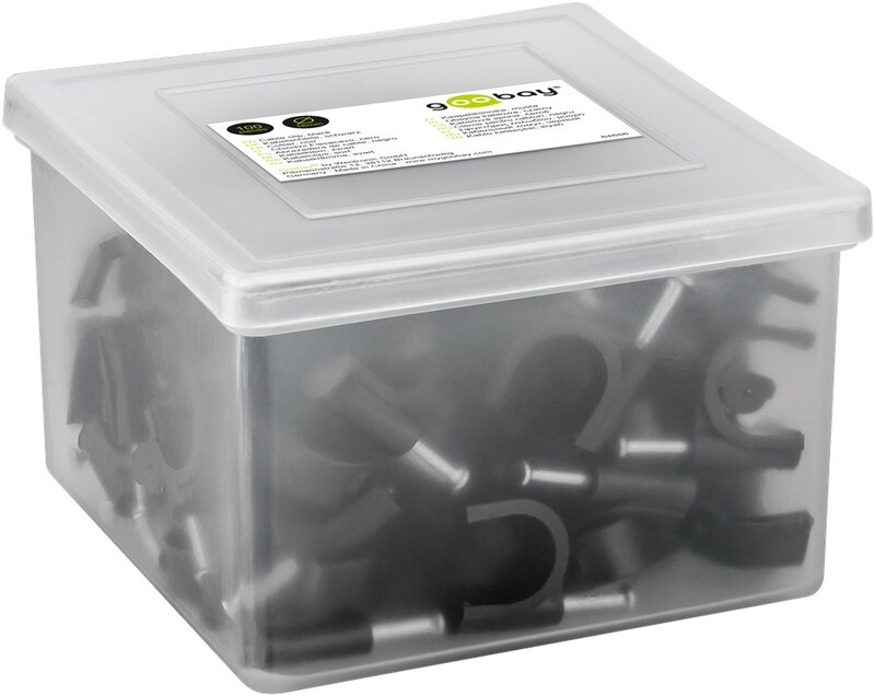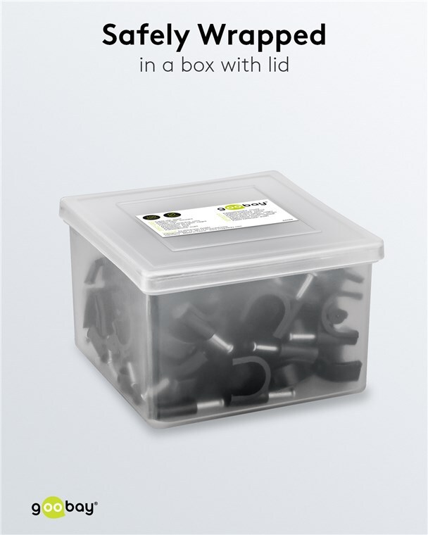 Cable organizer ideal for laying cables on walls, door frames and corners. High-quality stabilised PE plastic and galvanised steel nails. You may use the cable clips with nail indoors and outdoors and achieve good insulation, corrosion resistance and aging resistance.