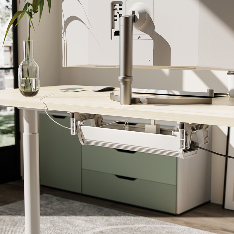- Skrýva káble a napájacie šnúry pre prehľadne organizovaný pracovný priestor.