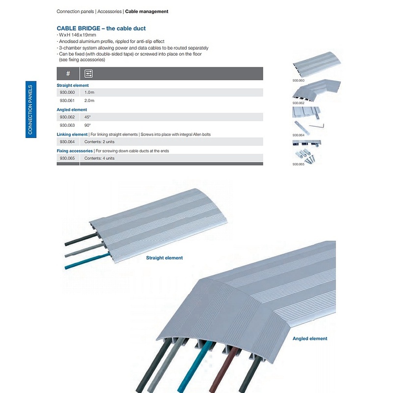Káblový kanál Bachmann Cable Bridge 2 m (930.061) je vyrobený z eloxovaného hliníka s vlnitou štruktúrou pre dostatočnú protišmykovú ochranu a zaisťuje väčšiu bezpečnosť na pracovisku. Trojkomorový systém umožňuje oddelenú inštaláciu silových a dátových káblov.