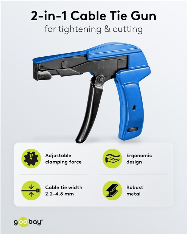 - 2-in-1 tool for quick tensioning and shortening of cable ties in just one step.