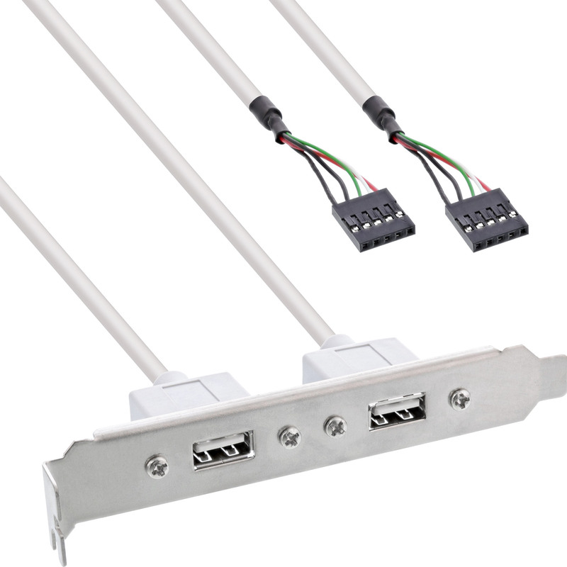 2x USB 2.0 A female mounted on a slot bracket with connection cable for connection to the mainboard with 2x 5pin connectors.