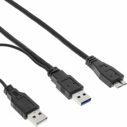 Kábel USB 3.2 Gen 1, 2xA-MICRO-B M/M 0.2m, 5Gbps, čierny, Y-kábel, Extra napájanie §§