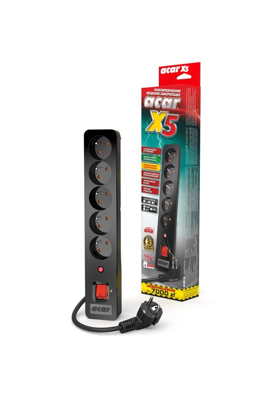 The acar X5 plus is one of the latest surge protective power strip sold under the brand name acar. Reliability, efficient construction solutions and modern design allow us to provide a 5-year warranty for the device. Unlike the basic version, the acar X5 plus is enriched with enhanced surge protection and with the indicator of its proper operation. The glossy surface emphasizes the uniqueness and fresh look of the product, making it visually eye-catching. Five socket outlets and small size make the power strip useful both at home and in the office. The automatic fuse provides practically maintenance-free operation. High efficiency and attractive appearance predispose the power strip to become the basic surge protection necessary everywhere. The mounting brackets are available from dealers.
