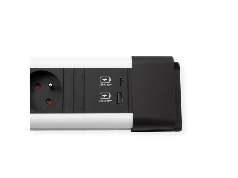 CONNECTUS Steckdosenleiste - Kunststoffprofil mit Designendkappen - Inkl. Langloch zur Wandmontage und Befestigungsm glichkeit fr Kabelbinder - 1xSchalter 2-polig - 6xUTE, schwarz - 1xUSB A/C 22W nabíjačka - Graues Profil mit schwarzen Endkappen - Zuleitung 2,0m, H05V5mm-F Schutzkontaktwinkelstecker - verpackt im Polybeutel