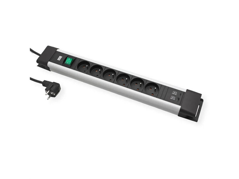 CONNECTUS Steckdosenleiste - Kunststoffprofil mit Designendkappen - Inkl. Langloch zur Wandmontage und Befestigungsmöglichkeit für Kabelbinder - 1xSchalter 2-polig - 6xUTE, schwarz - 1xUSB A/C 22W Charger - Graues Profil mit schwarzen Endkappen - Zuleitung 2,0m H05VV-F3G1,5mm², schwarz - mit Schutzkontaktwinkelstecker - verpackt im Polybeutel