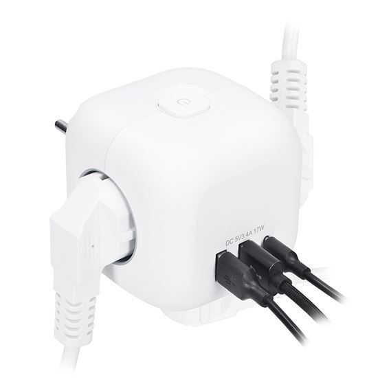 Rozbočka v tvare kocky s dĺžkou strany 8 cm spája tri uzemnené zásuvky s detskou poistkou a USB nabíjačku s portami USB-C a USB-A. Vďaka kompaktnému prevedeniu je ideálny na použitie v akomkoľvek interiéri. Podsvietený vypínač umožňuje jednoduché ovládanie všetkých zásuviek aj USB portov.