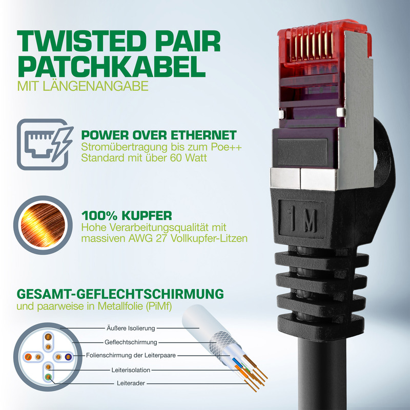 - Optimal interference protection: S/FTP shielding with paired metal foil (PiMf) and additional braided shielding provides reliable protection against crosstalk and external influences.