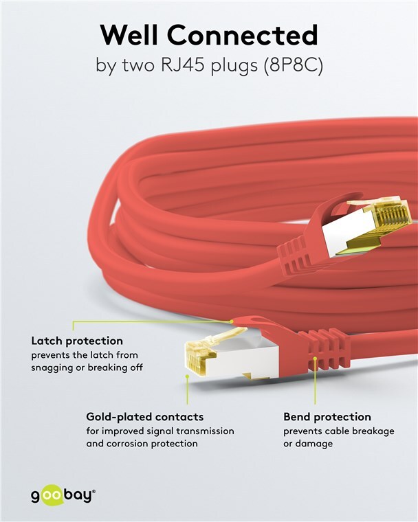 Our CAT cables transmit signals in top quality at high speed, always guaranteeing a stable connection. High-quality inner conductors, robust cable sheathing and precisely fitting plugs distinguish our portfolio of connection cables and plugs. Our solutions are especially suitable for high-resolution image transmission in 8K @ 60 Hz and 4K @ 120 Hz. Goobay always provides the perfect products for your network needs - whether you aim to set up a home or company network. Simply. All. You need!