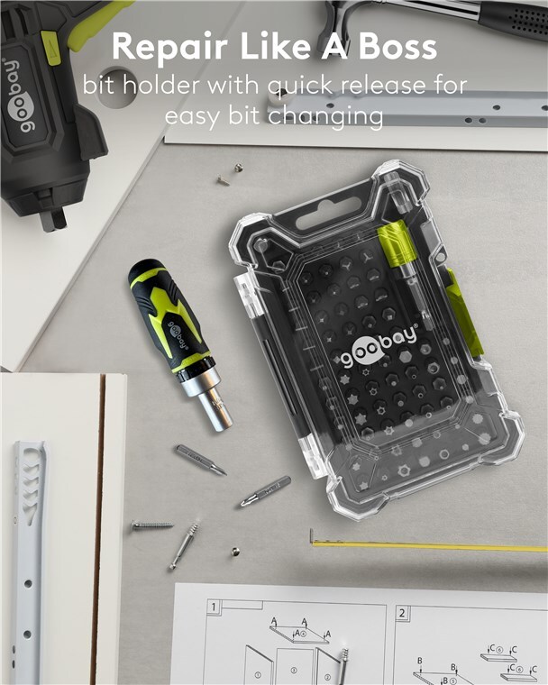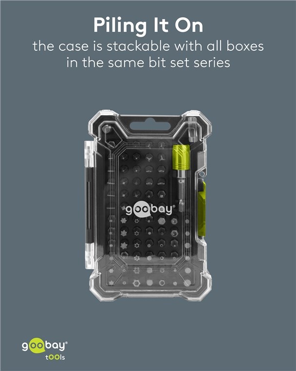 Every bit´s a hit: The tool set impresses with its variable bits, bit holder and handy transport box. The convenient quick-release function of the bit holder allows for lightning-fast bit changes. The special shape with rubberised corners and a robust closure makes the box particularly durable. The highlight: the boxes in this product series can be stacked on top of each other. Clever design, safe transport.