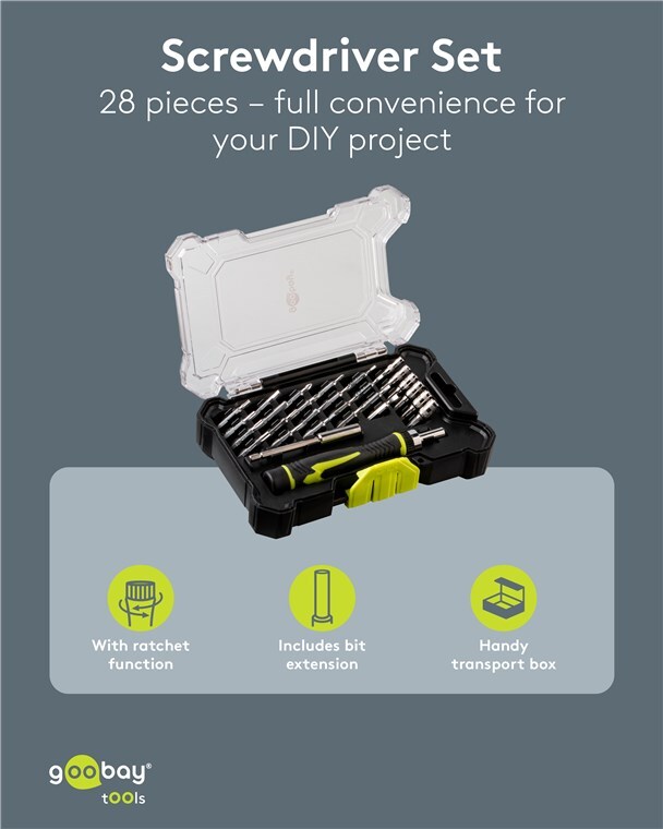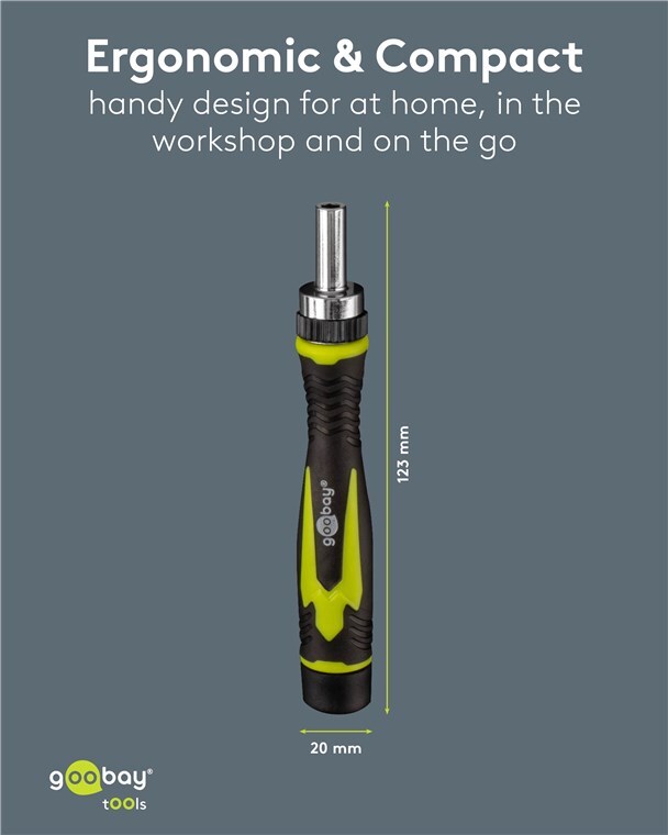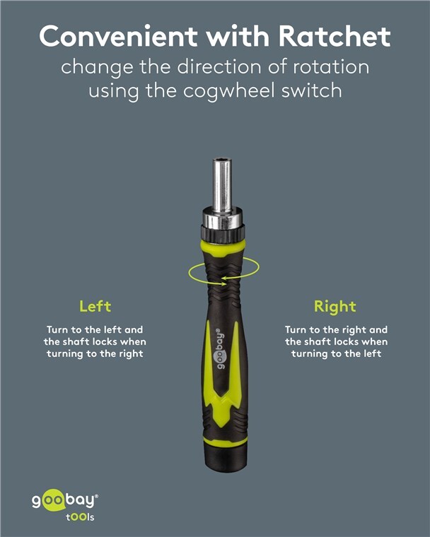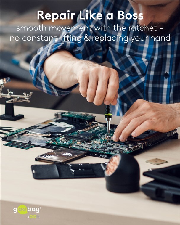 - Well thought-out design: The slim screwdriver with rubberised handle and ratchet function fits comfortably in the hand and ensures the necessary precision when working on smartphones, laptops, PCs, drones, etc.