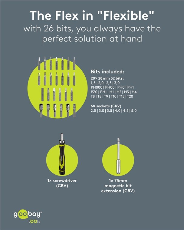 - Includes 1x bit holder extension (length 75 mm), 6x sockets (2.5-5 mm, CRV) and 20 bits made of shock-resistant S2 steel: 4x flat slot, 6x cross-recess (PH, PZ), 4x hexagon (H), 6x 6-point star (T)