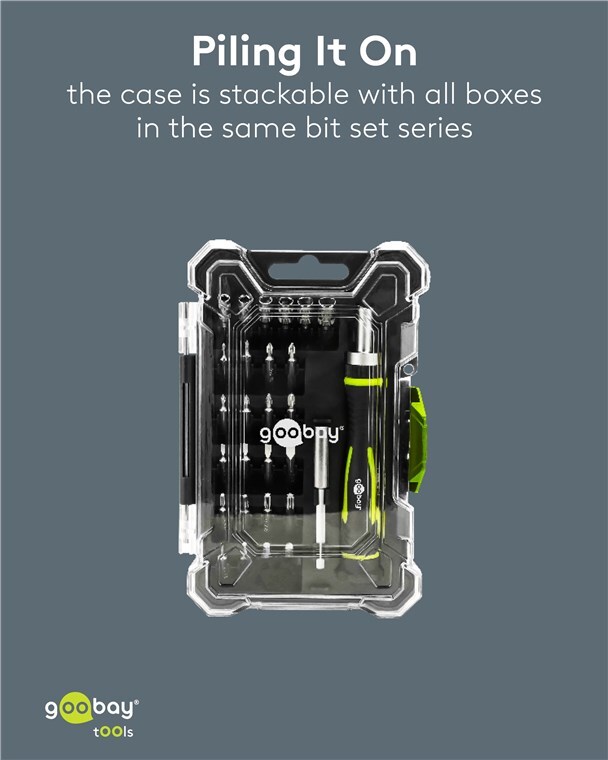 Every bit´s a hit: The screwdriver set impresses with its variable bits, socket set, ergonomic magnetic bit holder and handy transport box. The special shape with rubberised corners and a robust closure makes the box particularly durable. The highlight: The boxes in the product series can be stacked on top of each other. Clever design, safe transport.