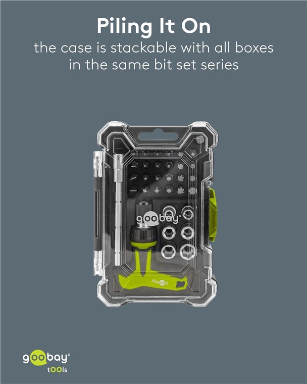 Every bit´s a hit: The screwdriver set impresses with its T-bit holder, socket set and handy transport box. The T-ratchet ensures extreme comfort and optimised power transmission when screwing. The special shape with rubberised corners and a robust closure makes the box particularly resistant. The highlight: The boxes in the product series can be stacked on top of each other. Clever design, safe transport.
