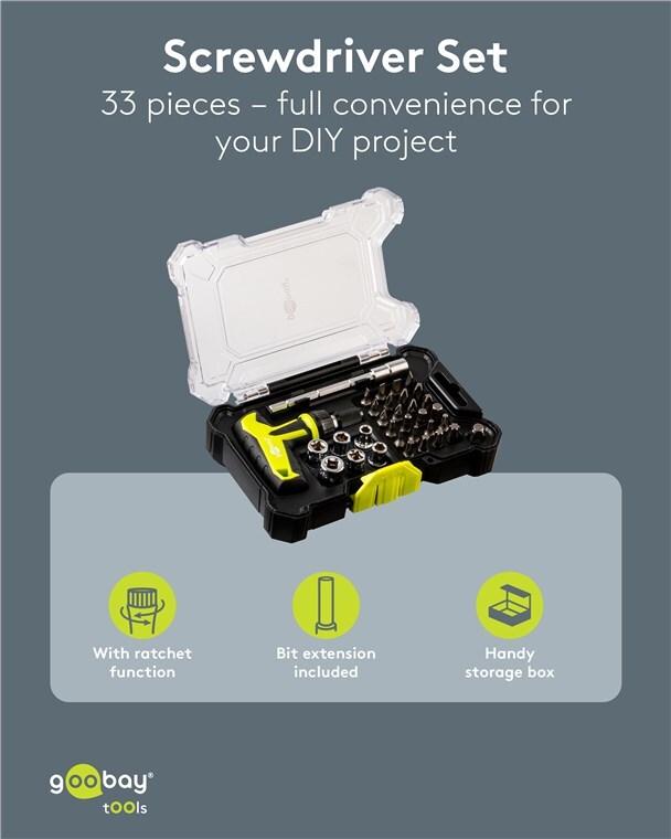 - Practical screwdriver set with standardised bits that also fit standard cordless screwdrivers