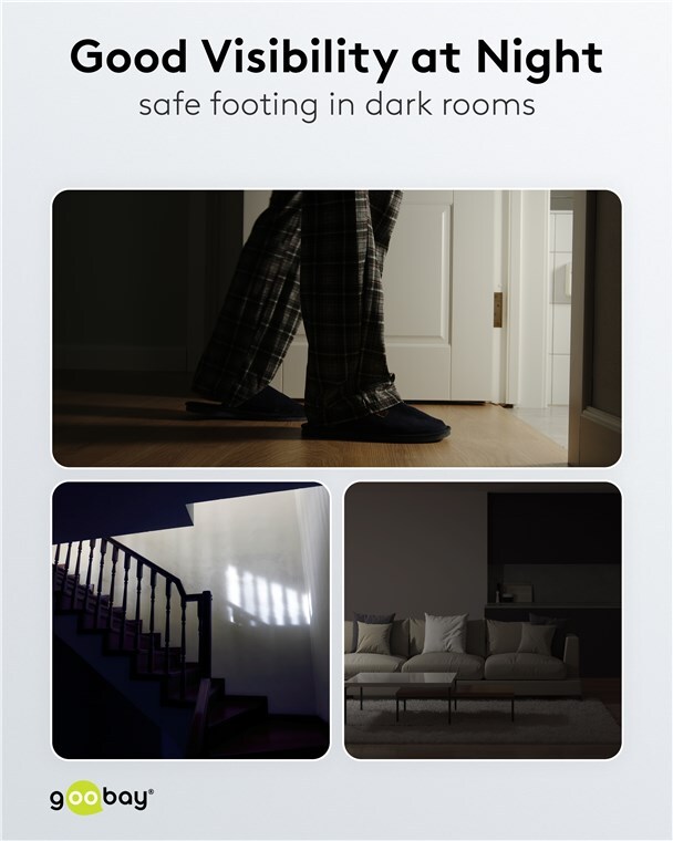 Always feel safe and sound: The night light with motion detector from Goobay reliably prevents tripping hazards at dusk and in the dark, e.g. when entering the home or getting up at night. For perfect comfort and safe orientation.