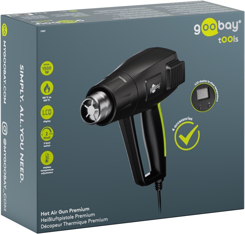 - Versatile heat gun, e.g. for attaching heat-shrink tubing, defrosting metal objects, shaping plastic or metal building materials