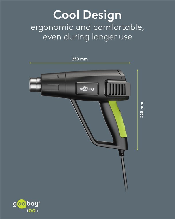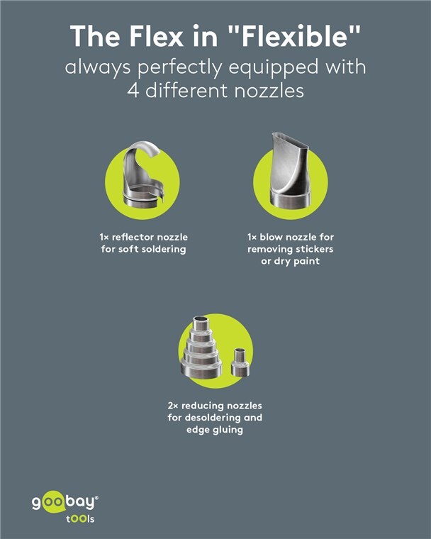 The hot air gun is the hottest tip in the DIY sector. Flexible in use with four different nozzles, it is the handy helper for numerous repair jobs and crafts, e.g. for extending cables with heat-shrink tubing and for desoldering and reshaping thin metal or plastic pipes.