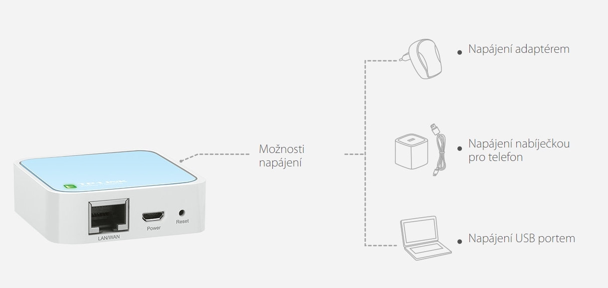 Router TL-WR802N může být napájen externím adaptérem nebo z počítače připojeného pomocí USB. Uživatelé