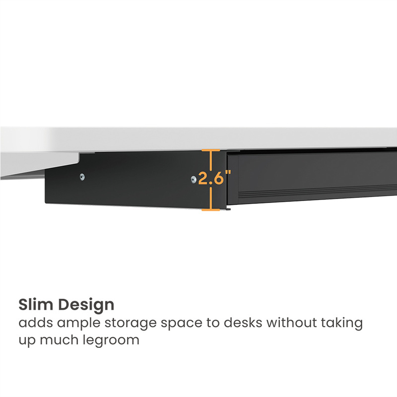 The ultra-slim design of this Underdesk Mount Storage Drawer offers a large storage space that keeps notes, phones, laptops and more within reach without affecting legroom. Smooth drawer opens and closes quietly and easily. The perfect organizational accessory for any desk!